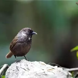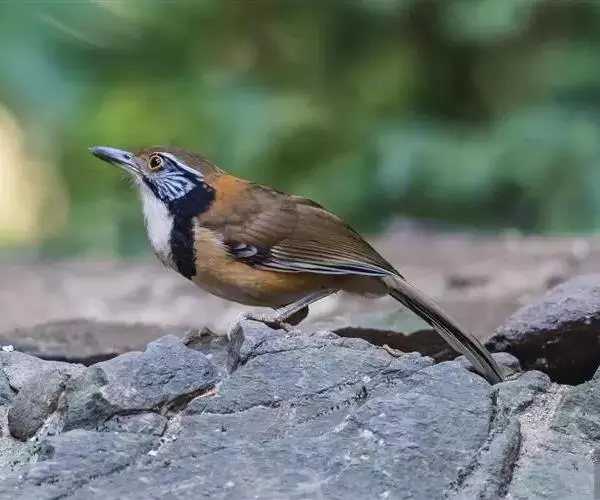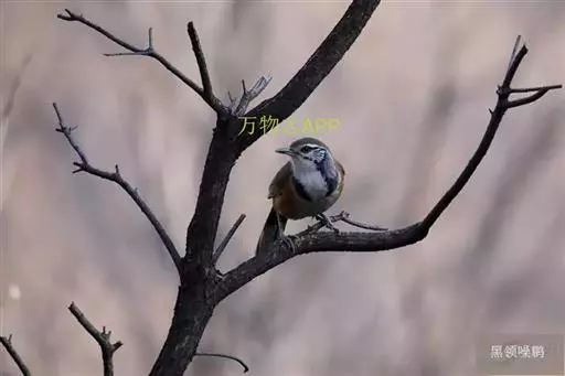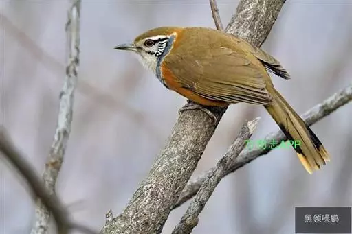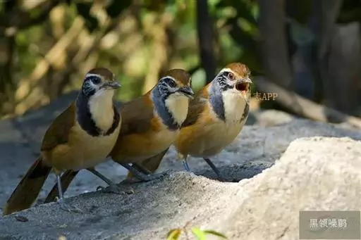 黑领噪鹛(学名:Garrulax pectoralis):中型鸟类,体长28-30cm。上体棕褐色。后颈栗棕色,形成半领环状。眼先棕白色,白色眉纹长而显著,耳羽黑色而杂有白纹。下体几全为白色,胸有一黑色环带,两端多与黑色颧纹相接。
