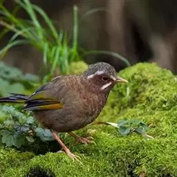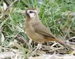 玉山噪鹛中等体型的褐色鸟类。白色长眉纹及髭纹显著;顶冠灰而具白色的鳞状斑纹;脸侧及颏褐色,…