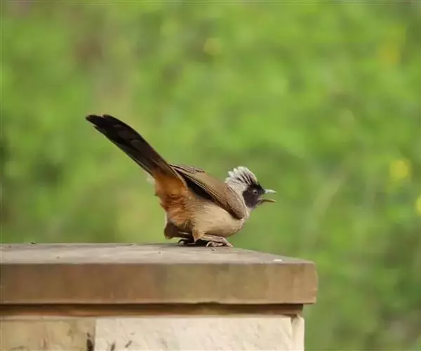 栗耳凤鹛,雌雄羽色相似。额、头顶至枕灰色,头顶有一短的不甚明显的羽冠,…