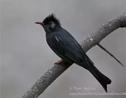体长约 17cm,雌雄鸟的羽色相同。喙粗短而呈红色,虹膜黑褐色,头部大致为灰色,但脸为亮橙色,背及翼羽褐色,腰鲜红色,喉、胸、腹及尾下覆羽淡灰色,尾羽暗褐色,脚铅黑色。
