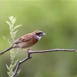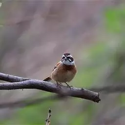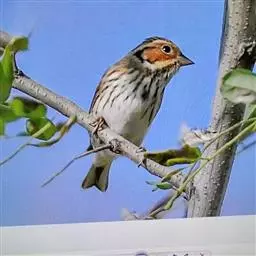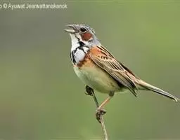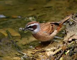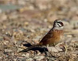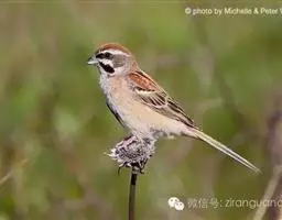 栗斑腹鹀:属小型鸣禽。体重19-25克,体长145-167毫米。头顶至背栗红色,眼先和颧纹黑褐色,…