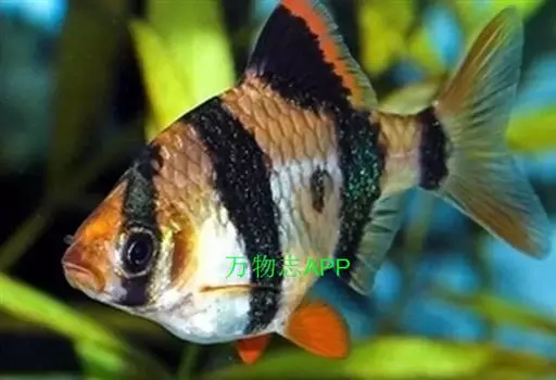 虎皮鱼(学名:Puntius tetrazona)是鲤科、无须魮属鱼类。体长4-6厘米,体高,侧扁略呈卵圆形。虎皮鱼体色基调为浅黄色,带有红色斑纹和小点,从头至尾有4条垂直的黑色条纹,第一条竖纹通过眼部,第二条在腮盖与背鳍之间,第三条起于背鳍末端直达臀鳍起点,第四条在尾鳍基部,斑斓似虎皮,因而得名虎皮鱼。