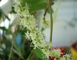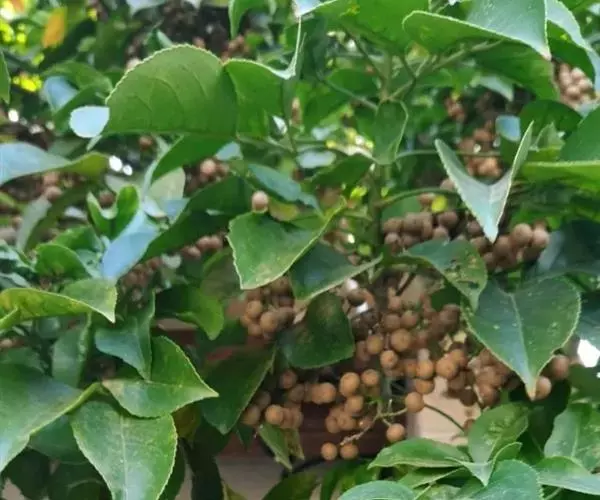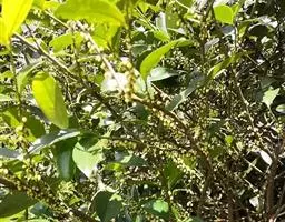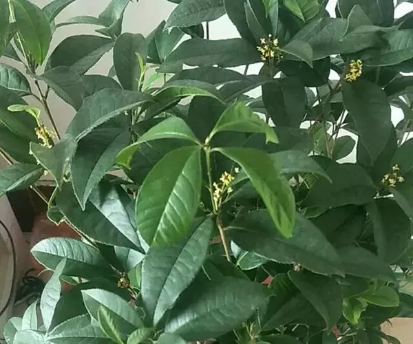 聚伞花序簇生于叶腋,或近于帚状,每腋内有花多朵;苞片宽卵形,质厚,长2-4毫米,具小尖头,无毛;花梗细弱,长4-10毫米,无毛;花极芳香;花萼长约1毫米,裂片稍不整齐;花冠黄白色、淡黄色、黄色或桔红色,长3-4毫米,花冠管仅长0.5-1毫米;雄蕊着生于花冠管中部,花丝极短,长约0.5毫米,花药长约1毫米,药隔在花药先端稍延伸呈不明显的小尖头;雌蕊长约1.5毫米,花柱长约0.5毫米。果歪斜,椭圆形,长1-1.5厘米,呈紫黑色。花期9-10月上旬,果期翌年3月。