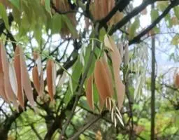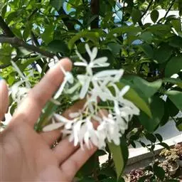 玉帘银丝桂:叶长椭圆形,较狭长,全缘,先端长渐尖,新枝紫色,新叶紫红色。一年可开花2-3次,每次花期6-7天,着花繁密,香气浓郁,花梗细长,达12-17mm,形似玉帘,花朵下垂,花瓣椭圆形,花冠平展,黄白色,雄蕊2,子房退化,不结实。