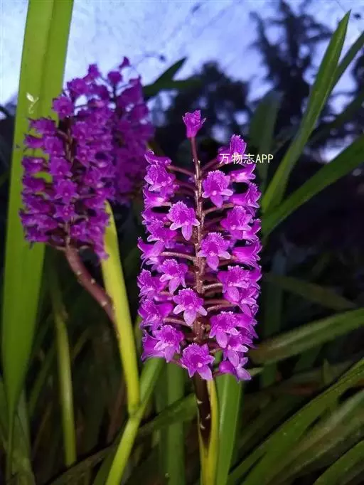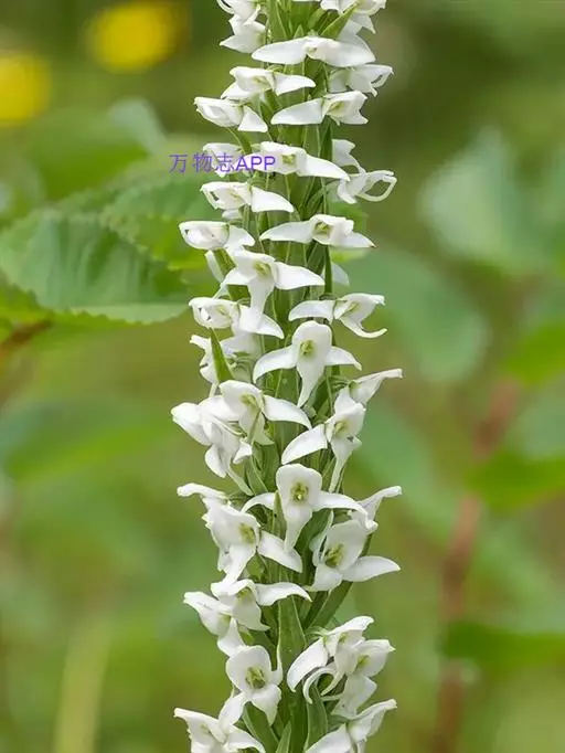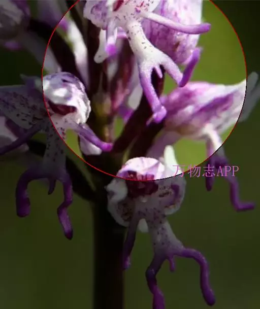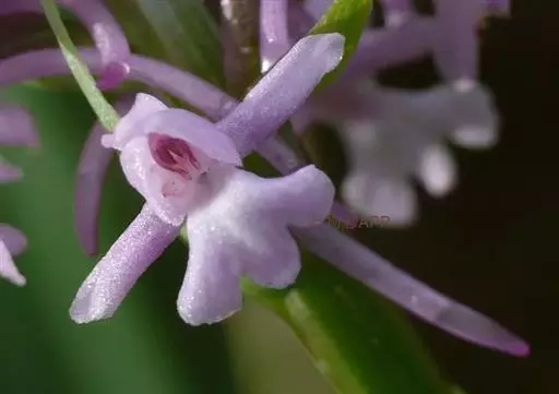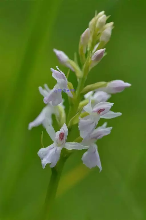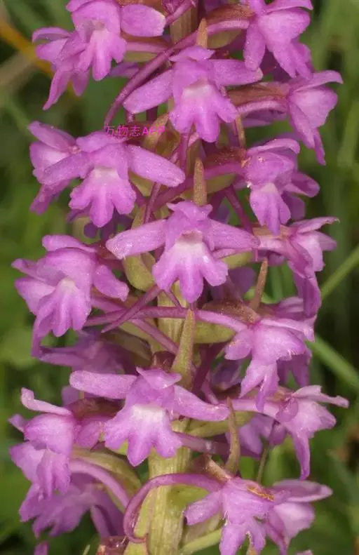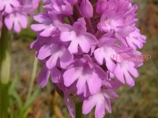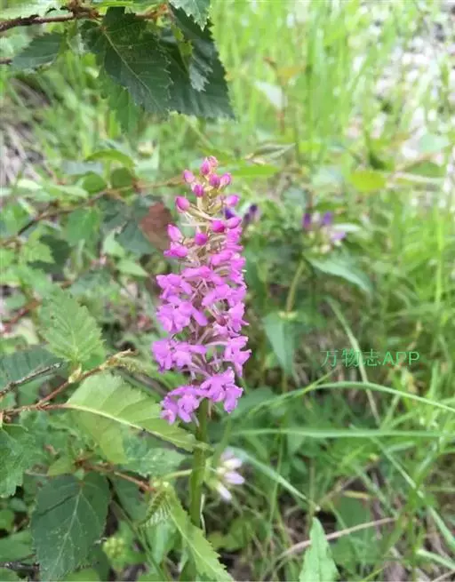 总状花序具多数密生的花,圆柱形,长5.5-15厘米;花苞片披针形,直立伸展,先端长渐尖成尾状,长于或等长于花;子房纺锤形,顶部稍弧曲,连花梗长约8毫米;花粉红色,罕为粉白色;中萼片宽椭圆形或宽卵状椭圆形,长3.5-5毫米,宽3-4毫米,先端急尖,略呈兜状,具3脉;侧萼片斜卵形,反折,边缘向外卷,较中萼片稍长或几等长,先端急尖,具3脉,前面的1条脉常具支脉;花瓣直立,斜卵状三角形,与中萼片等长,与侧萼片近等宽,边缘具细锯齿,先端急尖,具3脉,前面的1条脉常具支脉,与中萼片相靠;唇瓣向前伸展,宽倒卵形,长4-5毫米,前部3裂,中裂片较侧裂片大,三角形,先端钝或急尖;距细而长,狭圆筒形,下垂,长约1厘米,稍向前弯,向末端略增粗或略渐狭,长于子房;花粉团卵球形,具细长的柄和粘盘,粘盘线状披针形。花期6-8月。