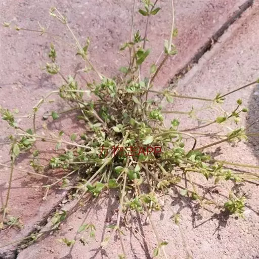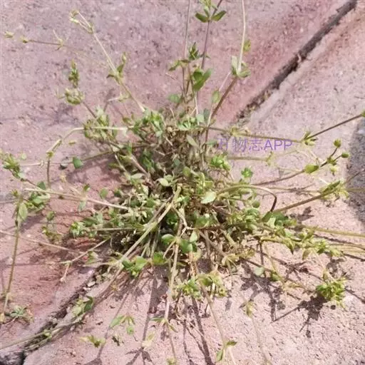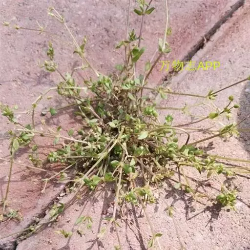 无瓣繁缕 茎通常铺散,有时上升,基部分枝有1列长柔毛,但绝不被腺柔毛。叶小,叶片近卵形,长5-8毫米,有时达1.5厘米,顶端急尖,基部楔形,两面无毛,上部及中部者无柄,下部者具长柄。