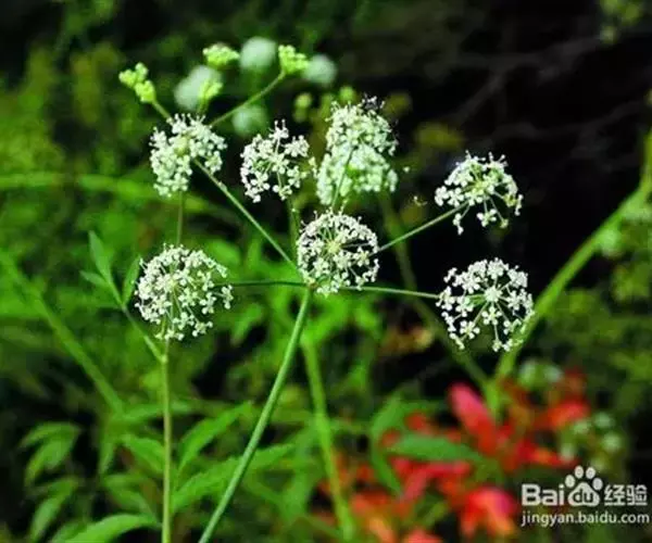 复伞形花序顶生或腋生,花序梗长2.5-10厘米,无毛;总苞片通常无或有1线形的苞片;伞辐6-25,近等长,长2-3.5厘米;小总苞片多数,线状披针形,长3-5毫米,宽0.5-0.7毫米,顶端长尖,中脉1条。小伞形花序有花15-35,花柄长4-7毫米;萼齿明显,卵状三角形;花瓣白色,倒卵形或近圆形,长1.5-2毫米,宽1-1.5毫米,顶端有内折的小舌片,中脉1条;花丝长约2.5毫米,花药近卵圆形,长约0.7毫米,宽0.5毫米;花柱基幼时扁压,光滑;花柱短,长约1毫米,向外反折。分生果近卵圆形,长、宽2-3毫米,合生面收缩,主棱阔,木栓质,每棱槽内油管1,合生面油管2;胚乳腹面微凹。花果期7-8月。