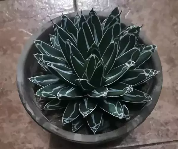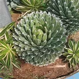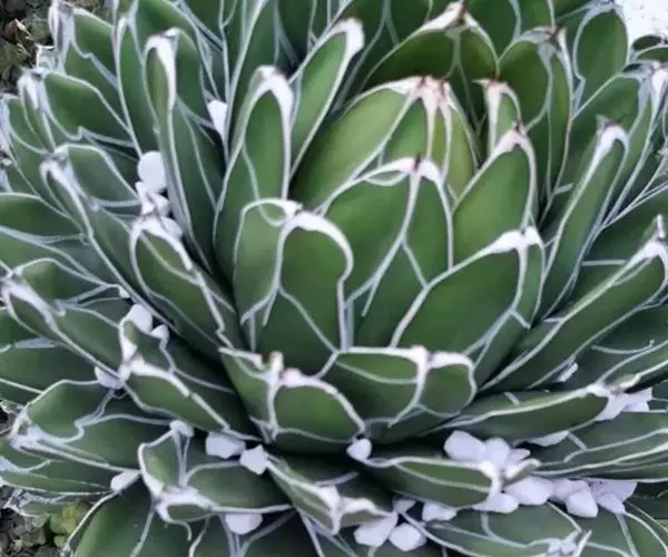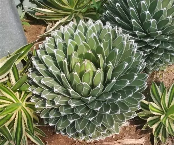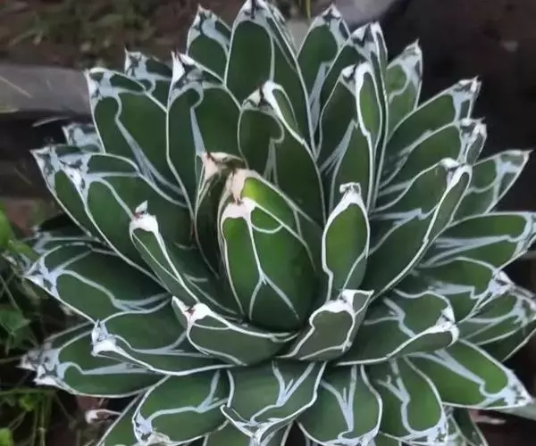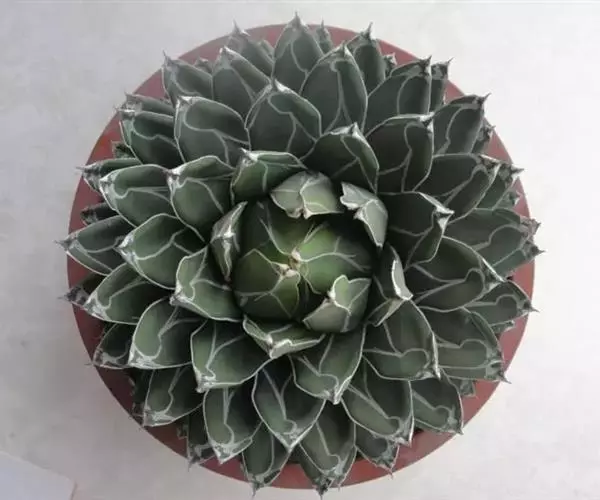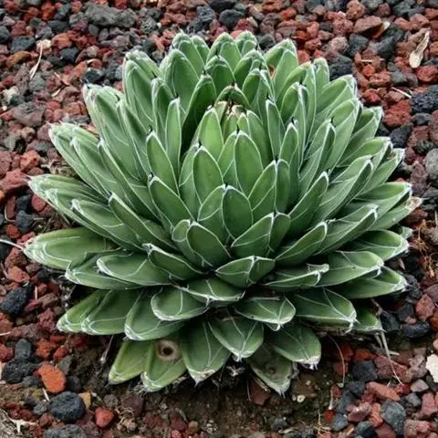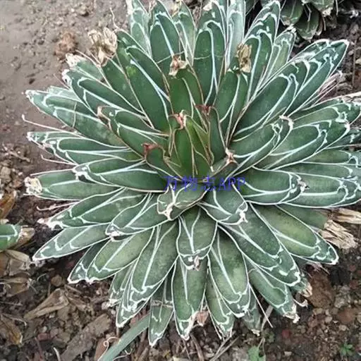 肉质草本。植株无茎,肉质叶呈莲座状排列,株幅可达40厘米;大型植株叶片可达100多枚,叶三角锥形,长10~15厘米,宽约5厘米,先端细,腹面扁平,背面圆形微呈龙骨状凸起;叶绿色,有不规则的白色线条,叶缘及叶背的龙骨凸上均有白色角质,叶顶端有0.3~0.5厘米坚硬的黑刺。植株生长30年左右才能开花,松散的穗状花序高达4米,小花淡绿色,长约5厘米;花后结籽,植株则枯萎死亡。其种名"victoriae-reginae"是纪念维多利亚女王,国外也称之为维多利亚龙舌兰、女王龙舌兰、皇后龙舌兰。