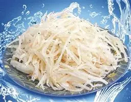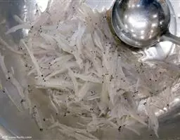 将狗鱼去鳞。去鳃,剖腹去内脏,去掉卵,洗净,剞去骨刺后将净肉切成粗丝,放入钵内加精盐、料酒腌渍码味。熟火腿、熟冬笋、香菌、丝瓜皮(淖熟)、泡红辣椒(去蒂、籽)均切成细丝。炒锅置火上,下熟猪油烧热(约80℃),将腌渍入味的鱼丝用蛋清豆粉糊上浆后入名滑散。滗去氽油。将鱼丝拨一边,下火腿等丝略炒,烹滋汁翻簸,淋上少许鸡油起锅装盘即成。