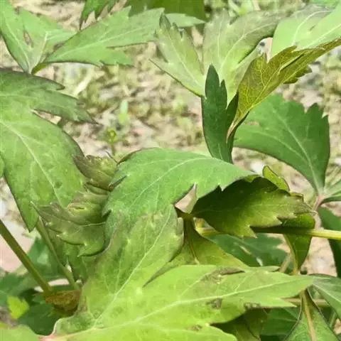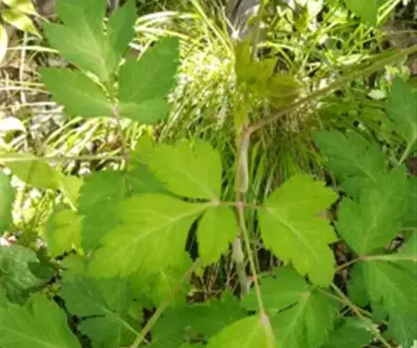 基生叶具长柄,叶柄长5-15厘米,基部有卵状披针形叶鞘;叶片轮廓宽卵形或三角状卵形,三出式二至三回分裂,第一回羽片具柄,柄长3.5-6厘米,末回裂片菱状倒卵形,先端渐尖,基部楔形至截形,无柄或具短柄,边缘具不整齐的3-4粗或圆锯齿,有时下部锯齿呈浅裂或深裂状,长1.5-6厘米,宽1.2-4厘米,下表面叶脉明显突起,两面无毛,或有时在下表面叶脉上以及边缘有稀疏短毛;茎下部叶具短柄,叶片形状与茎生叶相似;茎上部叶无柄,叶鞘稍宽,边缘膜质,叶片三出分裂,裂片狭窄,基部楔形,中间一枚基部下延。