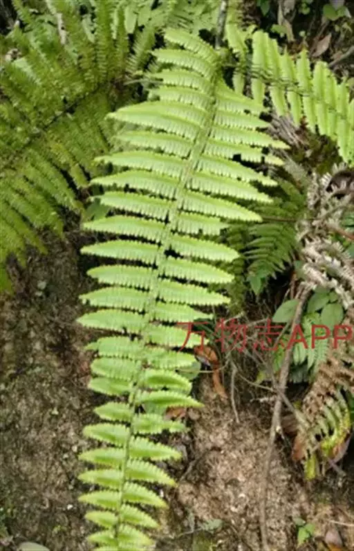 植株高约1.5米。根状茎横走,粗约3毫米,被鳞片。柄长约60厘米,粗约4毫米,光滑,暗棕色;一回羽片对生,具短柄,长55-70厘米,长圆形,中部最宽,18-24厘米,向顶端渐尖,基部稍变狭;小羽片22-35对,近对生或互生,平展,几无柄,长11-14厘米,宽1.2-1.5厘米,线状披针形,顶端渐尖,基部不变狭,截形,羽状深裂;裂片20-35对,互生,几平展,长7-10毫米,宽2.2-3毫米,宽披针形,钝头,基部汇合,缺刻尖狭,边缘全缘,干后稍内卷。中脉上面平,下面凸起,侧脉两面可见,约10-11对,叉状分枝,直达叶缘。叶草质,上面绿色,无毛,下面灰白色,沿小羽轴及中脉疏被锈色短星状毛,后变无毛。羽轴棕绿色,上面平,两侧有边,下面圆,光滑。孢子囊羣圆形,中生,生于上侧小脉上,由3-4个孢子囊组成。