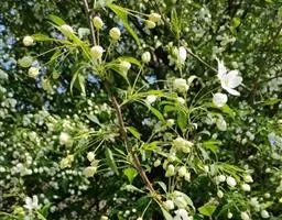 近似伞形花序,具花4-8朵,花梗长2-4厘米,被柔毛;苞片膜质,披针形,早落;花直径2.5-3厘米;萼筒钟形,密被长柔毛;萼片三角披针形,先端急尖或渐尖,全缘,外面有稀疏柔毛或近于无毛,内面密被柔毛,比萼筒稍长或近于等长;花瓣倒卵形,长1.2-1.5厘米,宽5-8厘米,白色,基部有短爪;雄蕊25,花丝长短不等,长不及花瓣之半;花柱4-5。基部有长柔毛,柱头扁圆,比雄蕊稍长。果实卵形或近球形,直径1-1.5厘米,红色,萼片脱落很迟,萼洼微隆起;果梗长2-4厘米,有长柔毛。花期5-6月,果期9月。