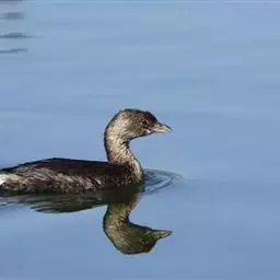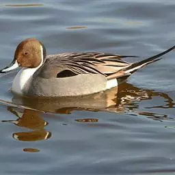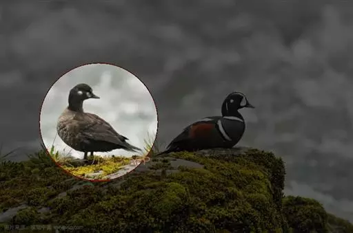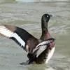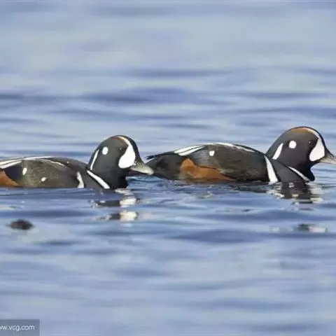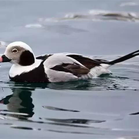 黑海番鸭 黑海番鸭雄鸟头、颈和上下体均黑色,上体微具光泽。翅下覆羽黑褐色和银灰色,尾黑色,长而尖。 雌鸟头顶和后颈暗褐色,头侧、颈侧、颏和喉灰白色,颈侧缀有细小淡褐色斑点,上体暗灰褐色,具灰白色端斑,胸侧和两胁也具灰白色端斑。胸和腹淡灰褐色,腹具少许不甚明显的灰白色斑纹。腋羽、肛周及尾下覆羽暗褐色;翼下覆羽暗灰褐色而具灰白色狭缘。