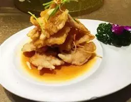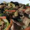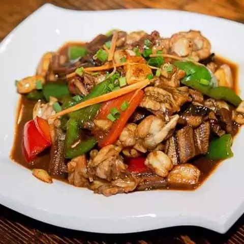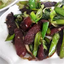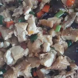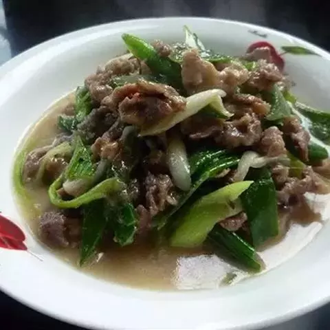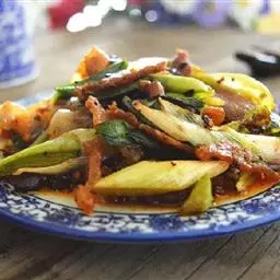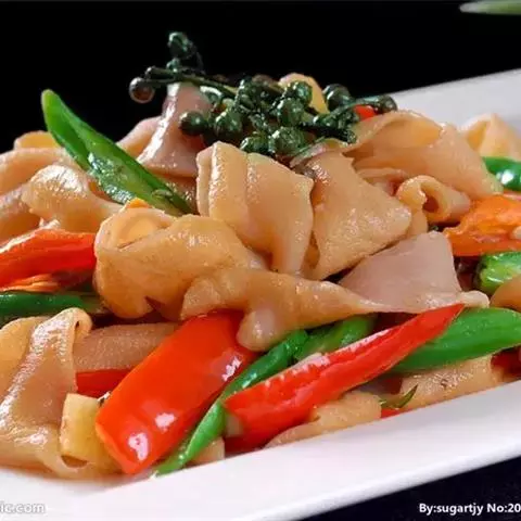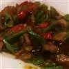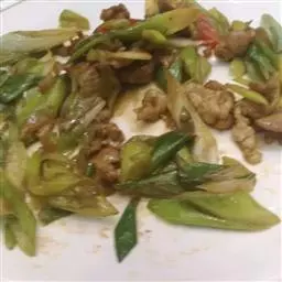 14.把煎好的猪肉片放入翻炒会,最后撒上少许鸡精即可出锅。