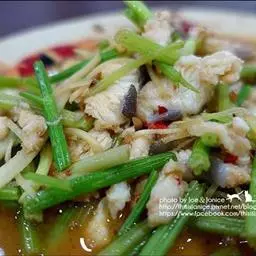 3、锅内热油爆香姜丝,放入肉丝划炒至变色,倒入半边豆角;