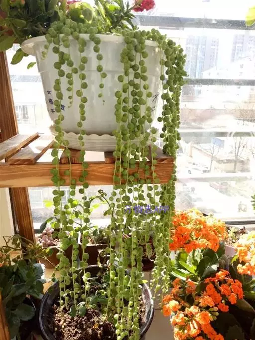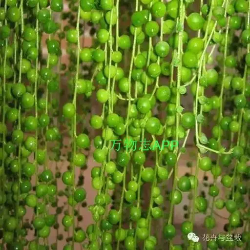 珍珠吊兰(Senecio rowleyanus H. Jacobsen) 因鼓鼓、饱满翠绿的椭圆形小叶子形似珍珠状而得名。又名翡翠珠、佛珠吊兰、翡翠珠、绿之铃,绿铃。菊科千里光属多肉植物,花期一般是当年的12月至翌年1月。