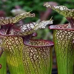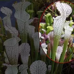 紫瓶子草(学名:Sarracenia purpurea)是多年生草本植物,也是瓶子草属的食虫植物里最矮小的品种,具有紫色的瓶子,瓶子很小,大约只有30厘米长,生长着偏向一侧的花朵,颜色鲜艳,亚种和变种很多。形态和猪笼草的笼子相似,能分泌蜜汁和消化液,受蜜汁引诱的昆虫失足掉落瓶中,瓶内的消化液会把昆虫消化吸收。生长范围几乎遍布美国东海岸、大湖区和加拿大东南部,成为最常见且广泛分布的瓶子植物。它也是唯一可以居住在冷温带的瓶子草属植物。