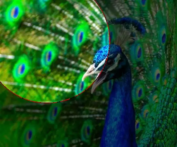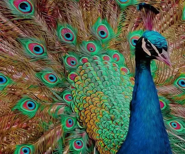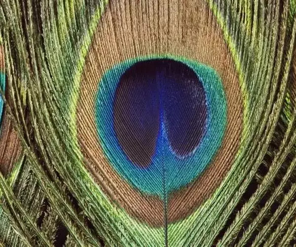 蓝孔雀羽片上缀有眼状斑,这种眼状斑是由紫、蓝、黄、红等构成。开屏时光彩夺目,尾羽上反光的蓝色的“眼睛”可以用来吓天敌。蓝孔雀还会抖动其尾羽,发出“沙沙”声。雌性蓝孔雀比较容易受“眼睛”多的雄鸟的吸引。雌性相对于雄鸟雌鸟比较小,很不显眼,其身长仅约1米,重2.7至4千克。羽色主要为灰褐,无尾屏,无距。幼孔雀的羽冠簇为棕色,颈部背面为深蓝绿色,羽毛松软,有时出现棕黄色。