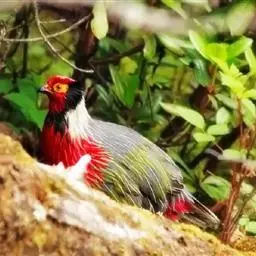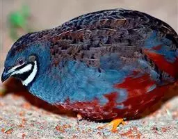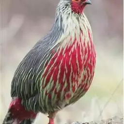 血雉雉科血雉属鸟类,别名血鸡、松花鸡,血雉的雄鸟大覆羽、尾下覆羽、尾上覆羽、脚、头侧、腊膜为红色,…