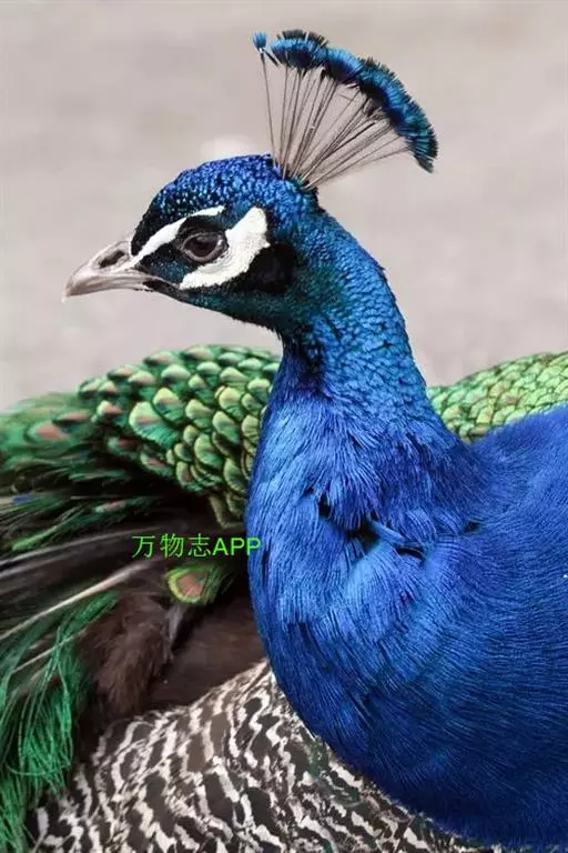 蓝孔雀(学名:Pavo cristatus):体长90-230厘米,翼展130-160厘米,体重4-6千克。雄鸟具直立的枕冠,羽色华丽,尾上覆羽特别延长,远超过尾羽。具20枚尾羽,形长而稍呈凸尾状;尾下覆羽为绒羽状;两翅稍圆,第1枚初级飞羽较第10枚短,第5 枚稍微最长;跗蹠长而强,远较中趾连爪为长,雄者具距。