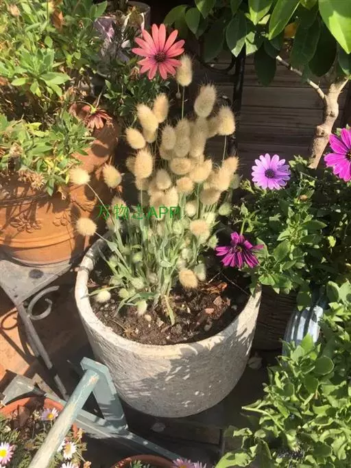 兔尾草(Lagurus ovatus L.)一般指禾本科兔尾草属 的一年生草本植物。丛生。圆锥花序,卵形,柔软,小穗多,花白色,雄蕊金黄色,初夏至秋季开放。叶长而窄,扁平。可快速自播繁殖。株高45cm,冠径15cm。极耐寒。