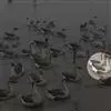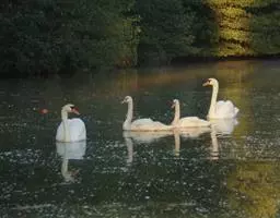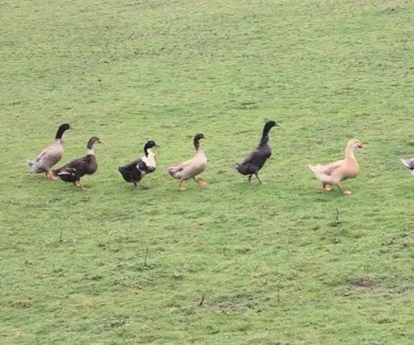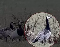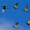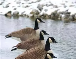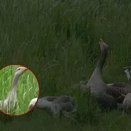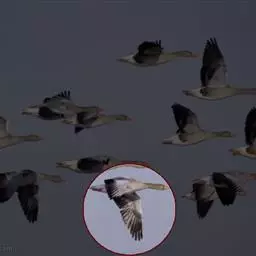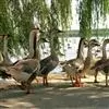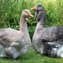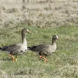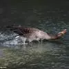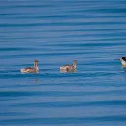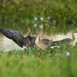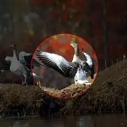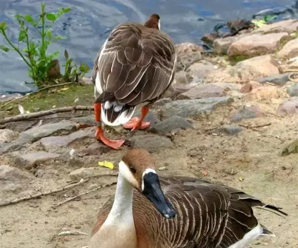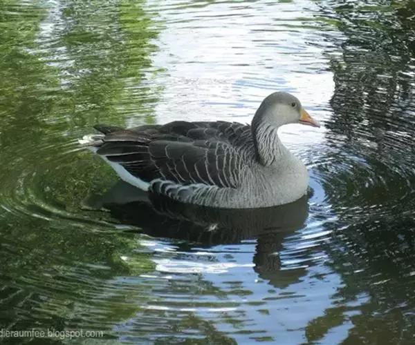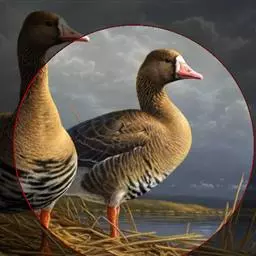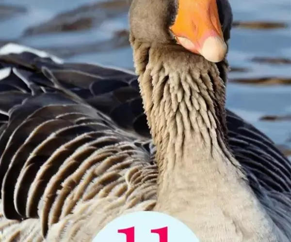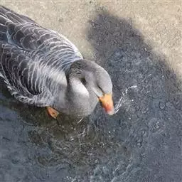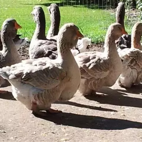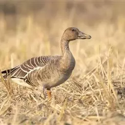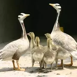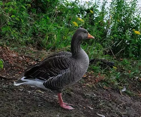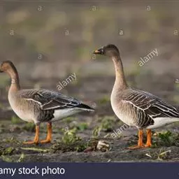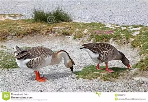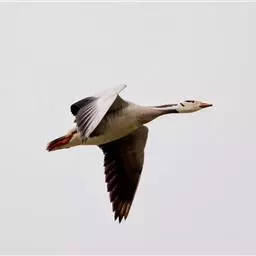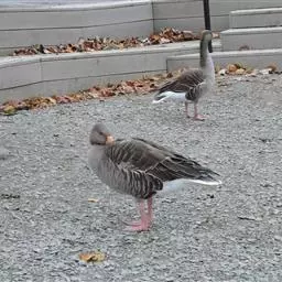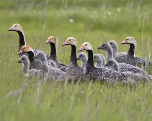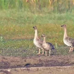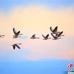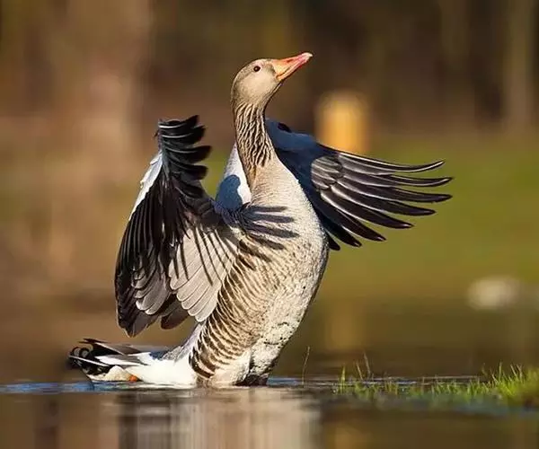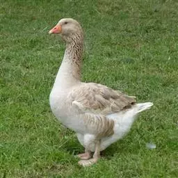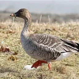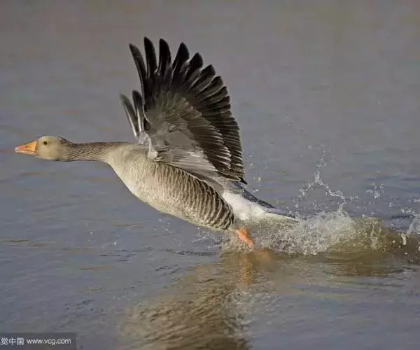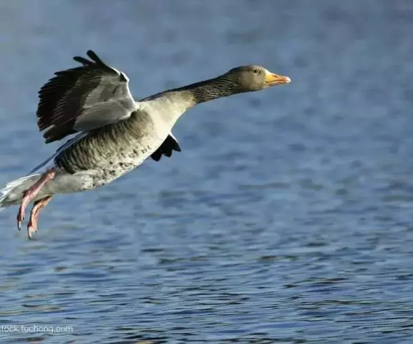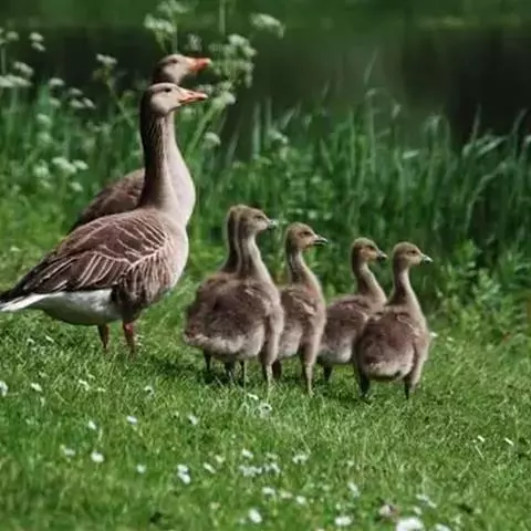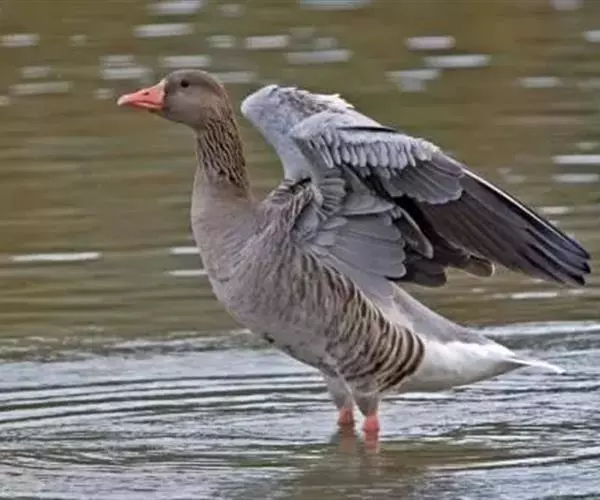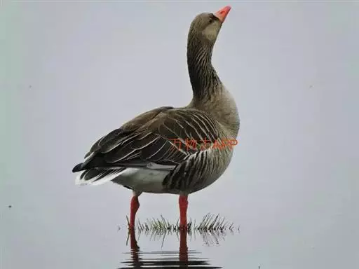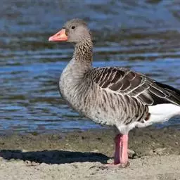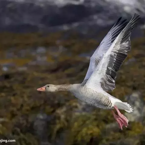 灰雁(学名:Anser anser):体长70-90厘米,翼展147-182厘米,体重2.5-4千克,寿命17年。体大而肥胖。嘴、脚肉色,上体灰褐色,下体污白色,飞行时双翼拍打用力,振翅频率高。脖子较长。腿位于身体的中心支点,行走自如。有扁平的喙,边缘锯齿状,有助于过滤食物。