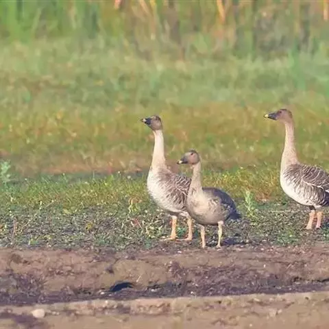 豆雁,雁形目鸭科。成鸟头、颈、背灰褐色,带淡黄色羽缘;尾上覆羽白色,尾羽黑褐色带白端,…