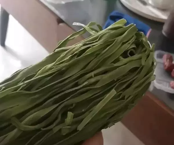 【原料】稍老点的豇豆适量、面粉若干、食用油少量、盐适量、蒜泥适量、小磨油、小米醋。