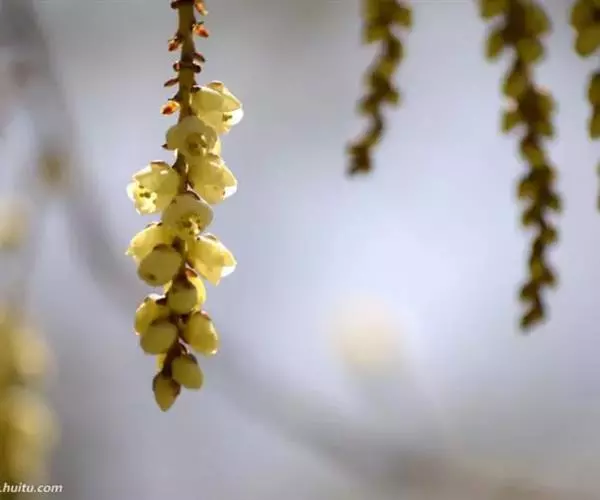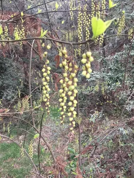 中国旌节花(Stachyurus chinensis Franch. )旌节花科、旌节花属落叶灌木,高2-4米。树皮光滑紫褐色或深褐色;小枝粗状,圆柱形,具淡色椭圆形皮孔。叶于花后发出,互生,纸质至膜质,卵形,长圆状卵形至长圆状椭圆形,先端渐尖至短尾状渐尖,基部钝圆至近心形,边缘为圆齿状锯齿,侧脉在两面均凸起,上面亮绿色,无毛,下面灰绿色;叶柄通常暗紫色。穗状花序腋生,先叶开放,无梗;花黄色,近无梗或有短梗;苞片1枚,三角状卵形,顶端急尖,长约3毫米;小苞片2枚,卵形;萼片4枚,黄绿色,卵形;花瓣4枚,卵形。果实圆球形,无毛,近无梗。花粉粒球形或近球形,赤道面观为近圆形或圆形,极面观为三裂圆形或近圆形,具三孔沟。花期3-4月,果期5-7月。