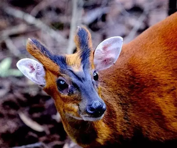 黑麂 黑麂是麂类中体型较大的种类。体长100~110厘米,耳长80~98毫米,尾长20~40毫米,后足长230~285毫米,颅全长132~147毫米。肩高60厘米左右,体重21~26千克。自吻端直至眶前区的面长为64~70毫米,一般短于颅全长的1/2。头骨短小,吻部较窄,鼻骨长直(长44~46毫米),且其最宽处在前部。泪骨形态与林麝相反,呈长方形,即多数为长大于宽(长17~22毫米,宽16.5~18.5毫米),仅极少数是长宽相近。