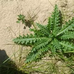 叶无柄,条状披针形,长6-10厘米,宽7-15 毫米,篦齿状羽状浅裂至深裂(叶轴宽3-8毫米),基部裂片抱茎;裂片条形或条状披针形,尖锐,边缘有不等大的锯齿或浅裂,齿端和裂片顶端有软骨质尖头,上面疏生长柔毛,下面毛较密,有腺点或几无腺点,下部叶花期凋落,上部叶渐小。