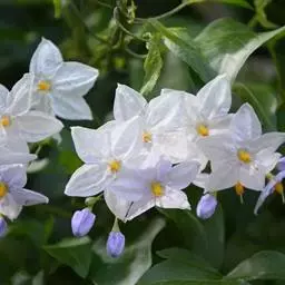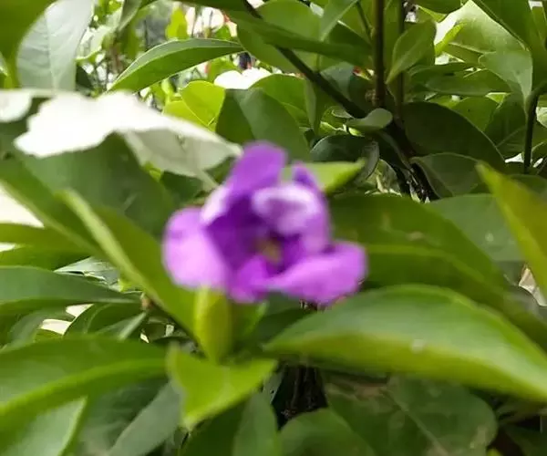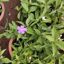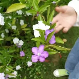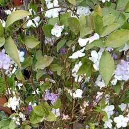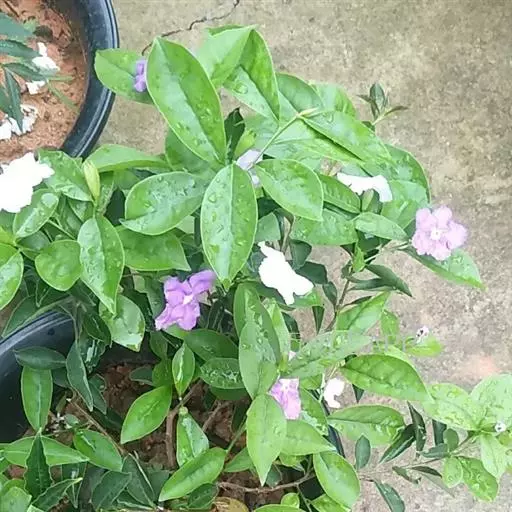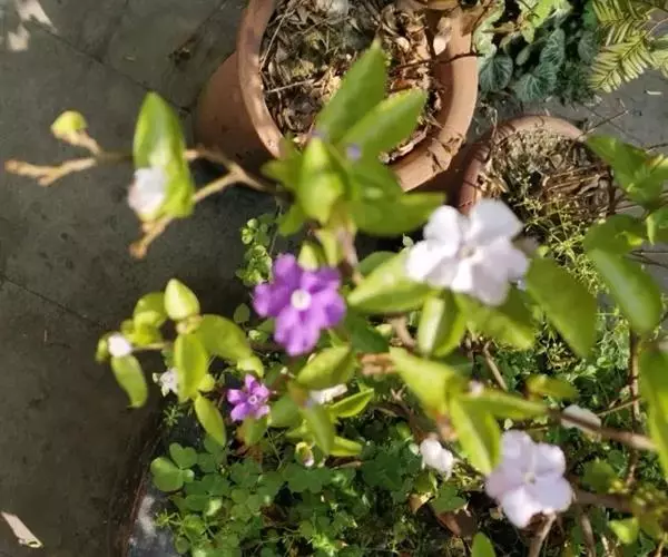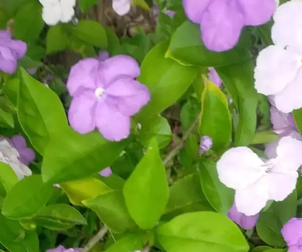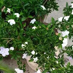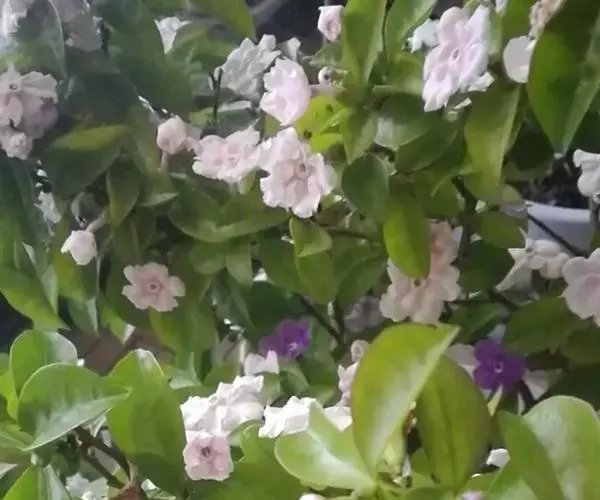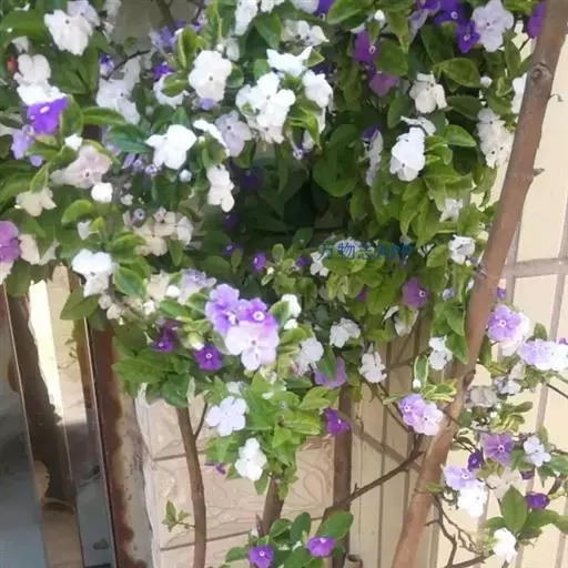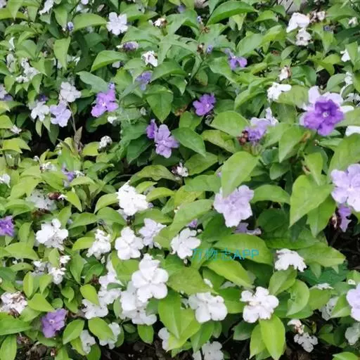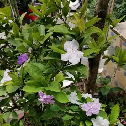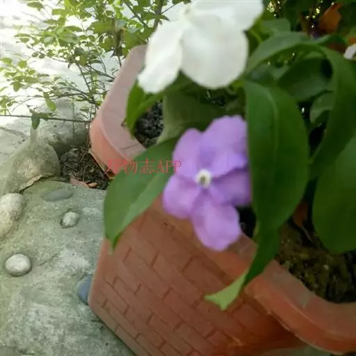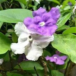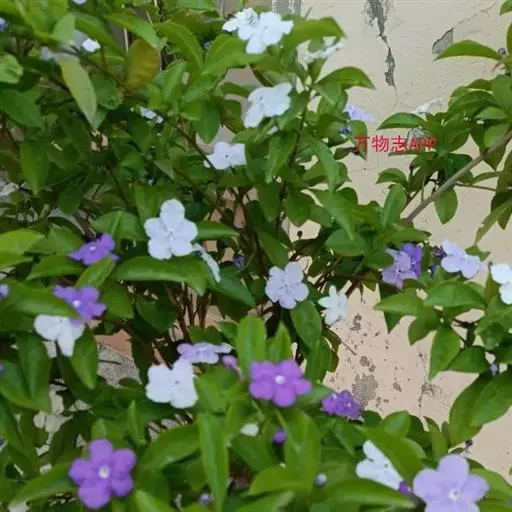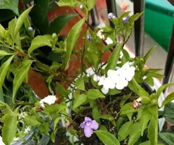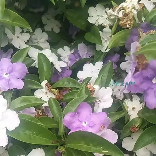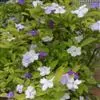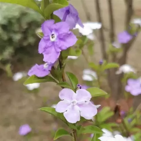 鸳鸯茉莉(Brunfelsia latifolia Benth.)属茄科鸳鸯茉莉属常绿矮灌木,是华北夏季露天摆放和冬季室内布置的优良盆栽花卉。鸳鸯茉莉高50至100厘米,单叶互生,花大多单生,少有数朵聚生的。花冠呈高脚碟状,有浅裂,花期4月至10月,单花开放5天左右。花朵初开为蓝紫色,渐变为雪青色,最后变为白色,由于花开有先后,在同株上能同时见到蓝紫色和白色的花,故又叫双色茉莉,其英文名之意为“昨天、今天、明天”,这形象地描绘出其花色的特殊变化。