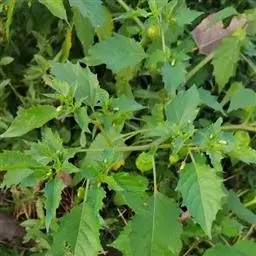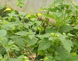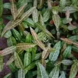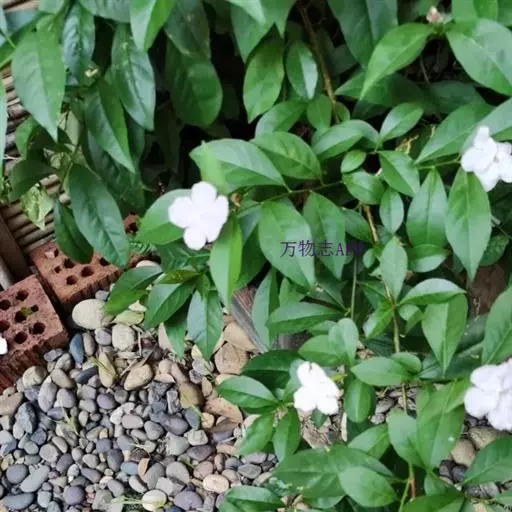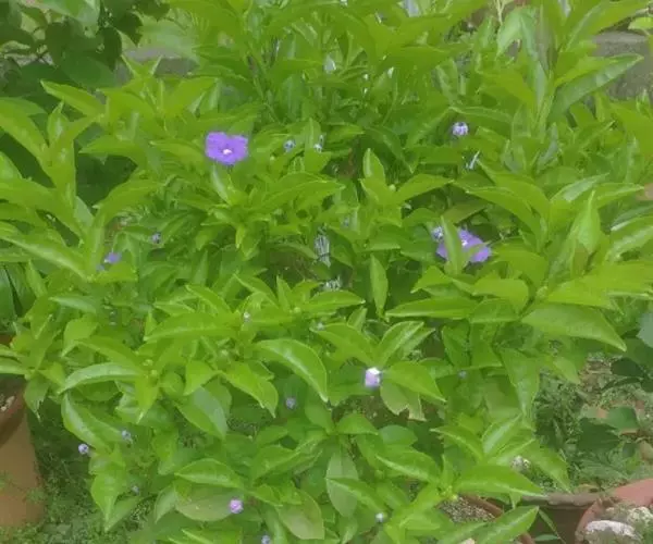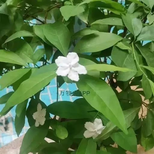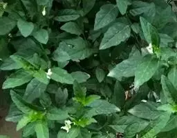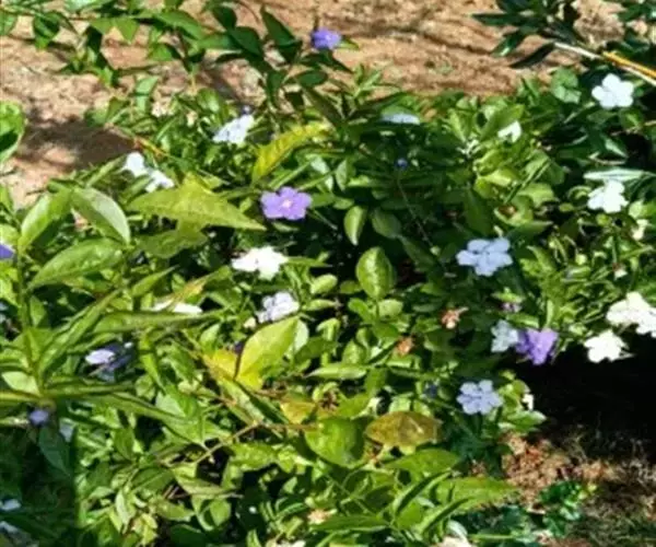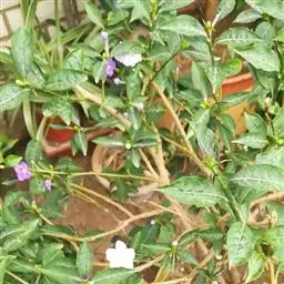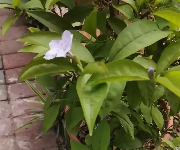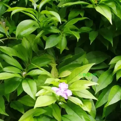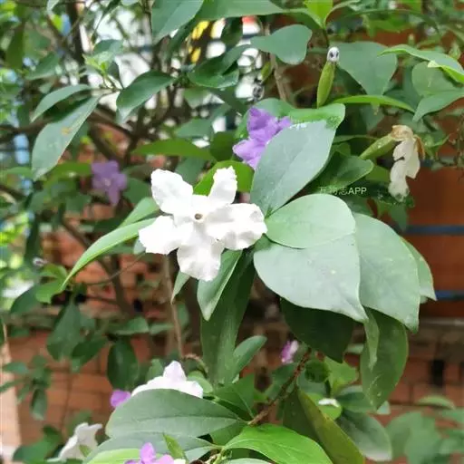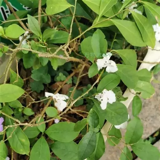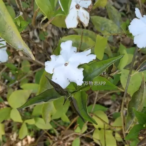 多年生常绿灌木,是华北夏季露天摆放和冬季室内布置 鸳鸯茉莉 的优良盆栽花卉。植株高约70~150厘米,盆栽经矮化后,株高可降低到30cm~60cm。茎皮成深褐色或灰白色,分枝力强,周皮纵裂。单叶互生,长披针形或椭圆形,先端渐尖,具短柄,口十面草绿色。叶长5~7厘米,宽1.7~2.5厘米,纸质,腹面绿色,背面黄绿色,叶缘略波皱。