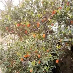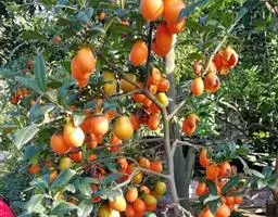 大秋 原产日本,国家资源圃于1997年从日本直接引进。该品种果实特大,平均重230克,最大果重368克,高馒头形,橙红色。果肉黄色均一,无褐斑。肉质酥脆,口感甜爽,汁多味浓,糖度达24%,品质极上。是日本近年育成的少有的大果、优质完全甜柿品种。有极高的商品性。在陕西省10月上中旬成熟。但必须强调,由于该品种属于富有系品种,引入中国后,与软枣亲和力极差,高接时应接在大柿树上,而不要接在软枣上;育苗时也必须接于本砧或以柿品种为中间砧的苗木上。另外,如成熟较早的完全甜柿品种伊豆、新秋;中熟品种前川次郎、兴津20;晚熟品种晚御所、骏河以及中国原产的罗田甜柿、秋焰、甜宝盖等甜柿品种在一定小气候下也可栽培生产。