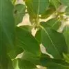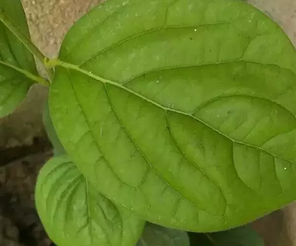 叶纸质,卵状椭圆形至倒卵形或近圆形,通常较大,长5-18厘米,宽2.8-9厘米,先端渐尖或钝,基部楔形,钝,圆形或近截形,很少为心形,新叶疏生柔毛,老叶上面有光泽,深绿色,无毛,下面绿色,有柔毛或无毛,中脉在上面凹下,有微柔毛,在下面凸起,侧脉每边5-7条,上面平坦或稍凹下,下面略凸起,下部的脉较长,上部的较短,向上斜生,稍弯,将近叶缘网结,小脉纤细,在上面平坦或微凹下,连结成小网状;叶柄长8-20毫米,变无毛,上面有浅槽。