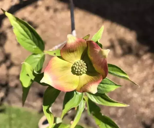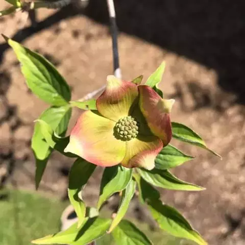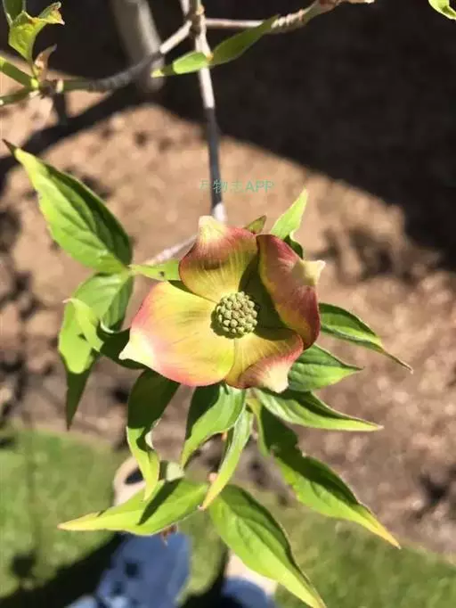 日本四照花,是四照花属落叶灌木至小乔木,高可达9m。小枝细,绿色,后变褐色,光滑。单叶对生,卵状椭圆形或卵形,长6~1 2cm,叶端渐尖,叶基圆形或广楔形,弧形侧脉4~5对,脉腋有黄或淡褐色毛,有4枚白色花瓣状总苞片,椭圆状卵形,长5~6cm