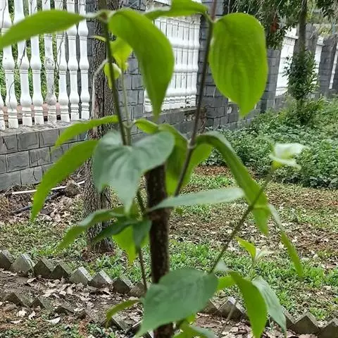 落叶小乔木;小枝纤细,幼时淡绿色,微被灰白色贴生短柔毛,老时暗褐色。叶对生,薄纸质,卵形或卵状椭圆形,长5.5-12厘米,宽3.5-7厘米,先端渐尖,有尖尾,基部宽楔形或圆形,边缘全缘或有明显的细齿,上面绿色,疏生白色细伏毛,下面淡绿色,被白色贴生短柔毛,脉腋具黄色的绢状毛,中脉在上面明显,下面凸出,侧脉4-5对,在上面稍显明或微凹下,在下面微隆起;叶柄细圆柱形,长5-10毫米,被白色贴生短柔毛,上面有浅沟,下面圆形。