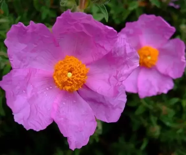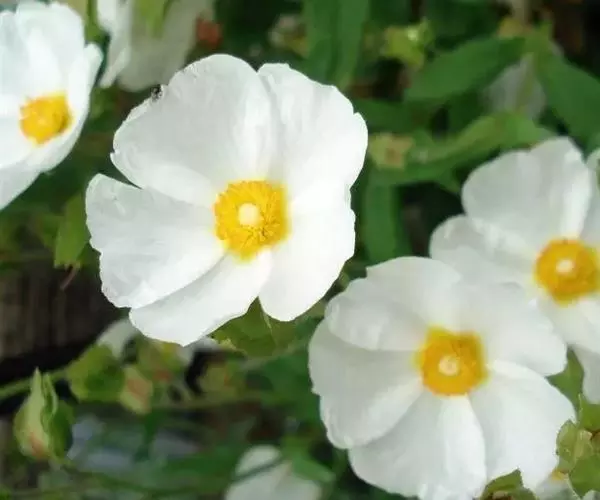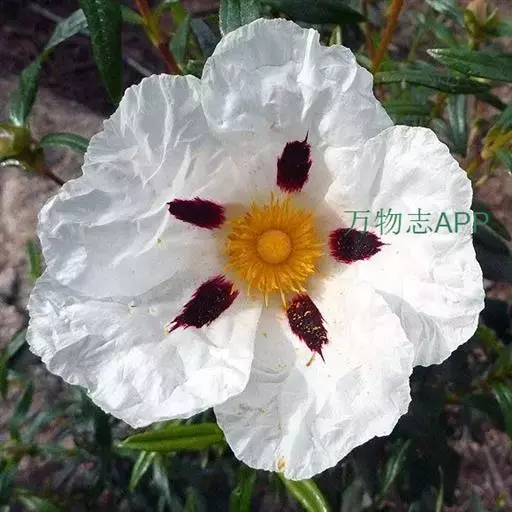 岩蔷薇,常绿灌木。直立。冠开张。叶窄,暗绿色,具黏性。花大而多,白色,花心雄蕊四周有红色斑,初夏开放。