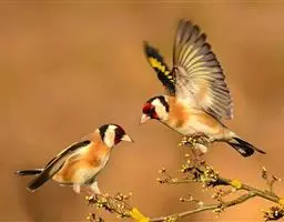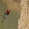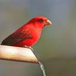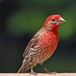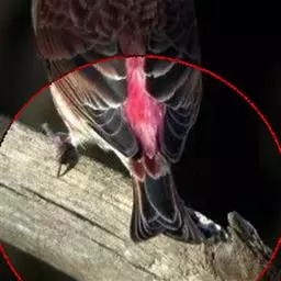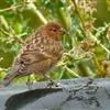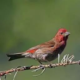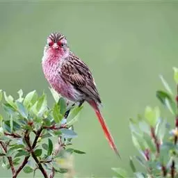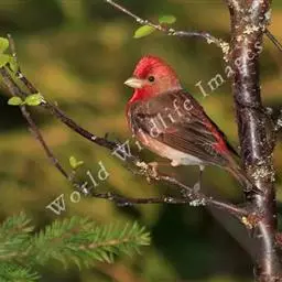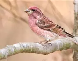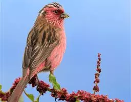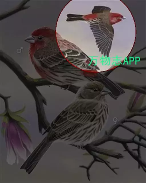 红腰朱雀:体长12-14厘米,小型鸟类。雄鸟前额和眉纹玫瑰粉红色,头顶和一宽的贯眼带深红褐色,背红…