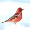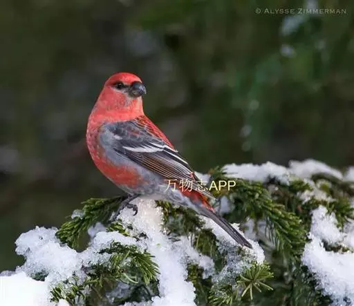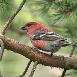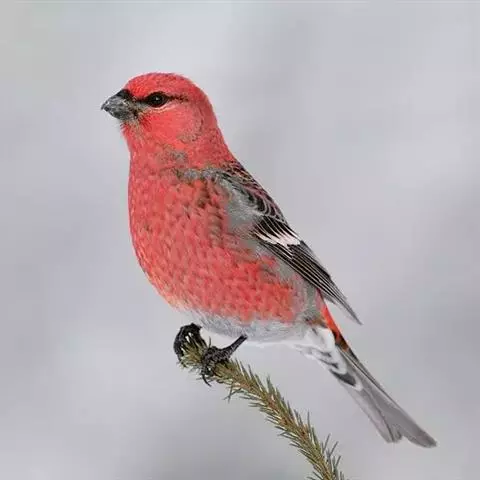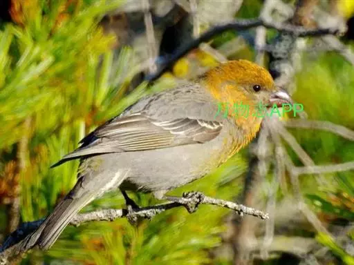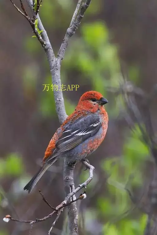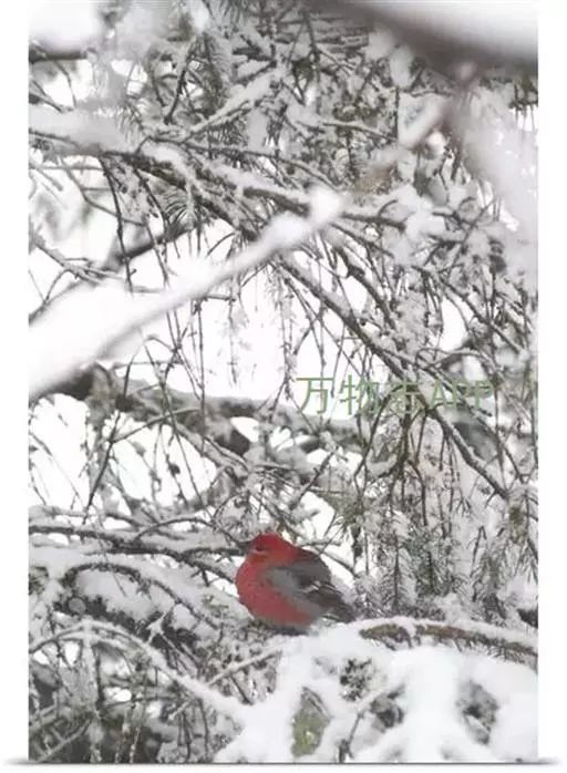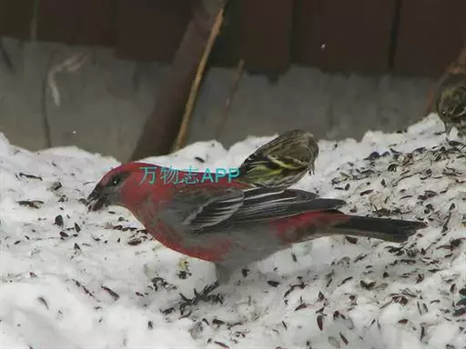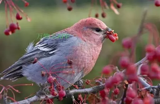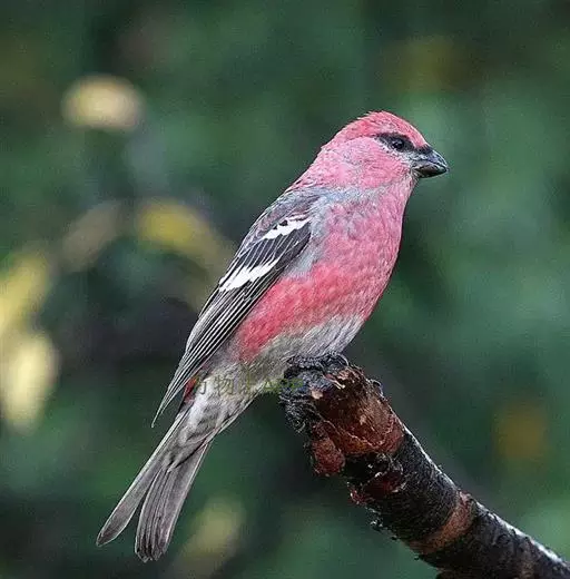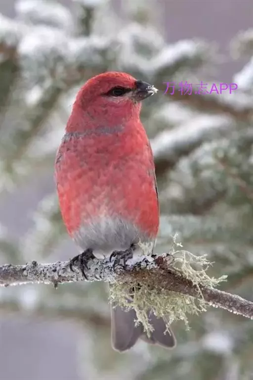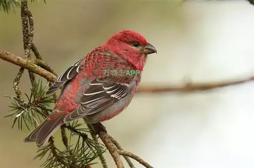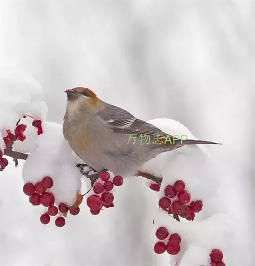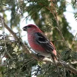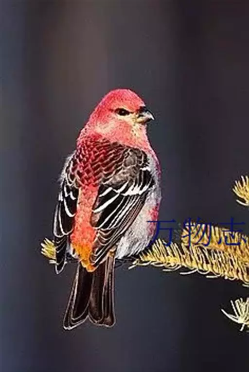 松雀(学名:Pinicola enucleator):体重48-57克,体长192-213毫米。是一种体型较大而尾长的雀。嘴厚而带钩,两道明显白色翼斑与近黑的翼成对比。成年雄鸟深粉红色,具别致的脸部灰色图纹。成年雌鸟似雄鸟但橄榄绿色取代粉红色。是一种非常漂亮的鸟,雄鸟呈红色,雌鸟呈绿色,两只鸟栖息于树枝上,红绿相映,十分有趣。幼鸟全身灰暗,具皮黄色的翼斑。与白翅交嘴雀雄雌两性的图纹相似,但嘴成钩状而非交叉,翼斑不如其显著,尾开叉较浅且色彩不显浓重。虹膜深褐色,嘴灰色,下嘴基粉红,脚深褐色。