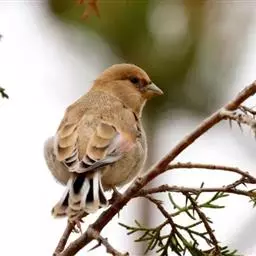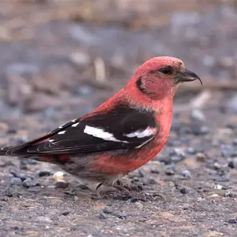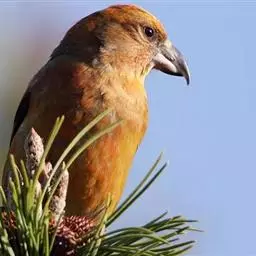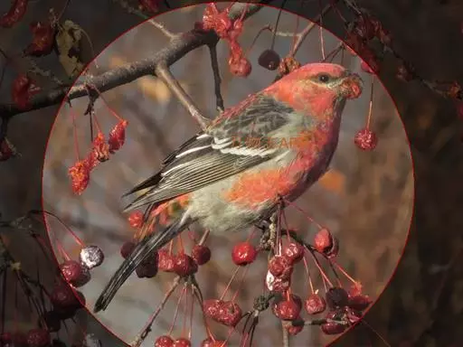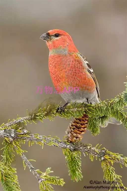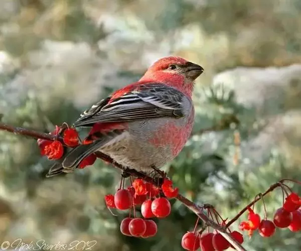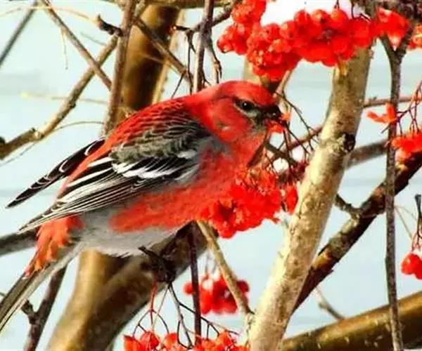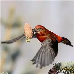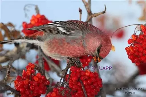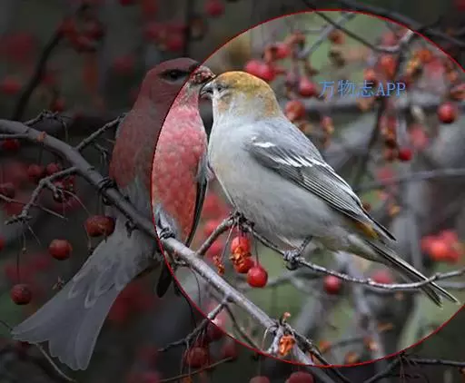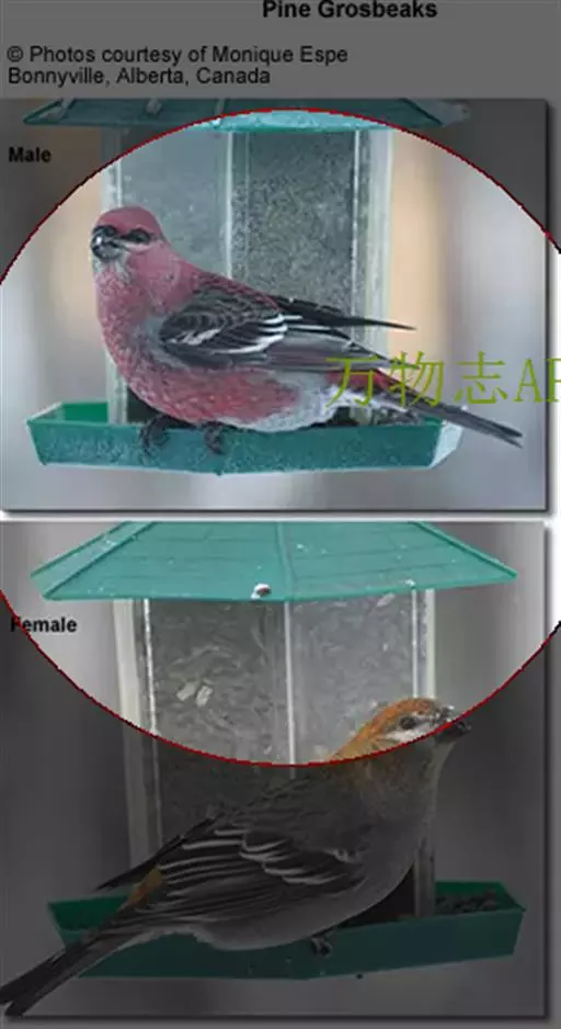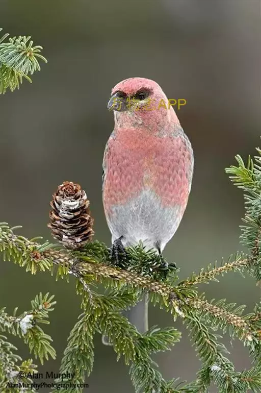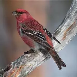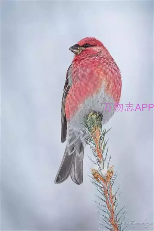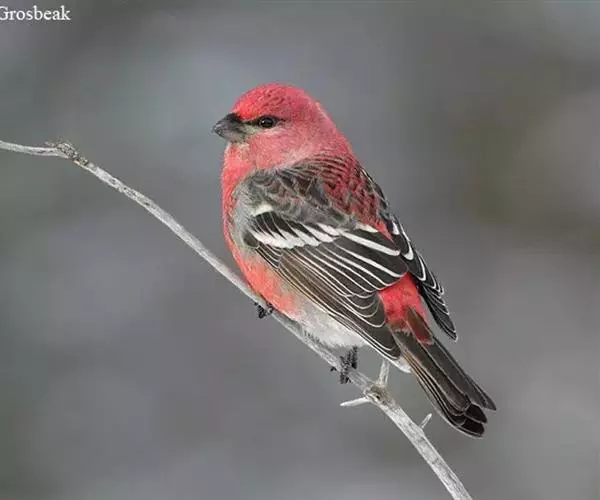 松雀(学名:Pinicola enucleator):体重48-57克,体长192-213毫米。是一种体型较大而尾长的雀。嘴厚而带钩,两道明显白色翼斑与近黑的翼成对比。成年雄鸟深粉红色,具别致的脸部灰色图纹。成年雌鸟似雄鸟但橄榄绿色取代粉红色。是一种非常漂亮的鸟,雄鸟呈红色,雌鸟呈绿色,两只鸟栖息于树枝上,红绿相映,十分有趣。幼鸟全身灰暗,具皮黄色的翼斑。与白翅交嘴雀雄雌两性的图纹相似,但嘴成钩状而非交叉,翼斑不如其显著,尾开叉较浅且色彩不显浓重。虹膜深褐色,嘴灰色,下嘴基粉红,脚深褐色。