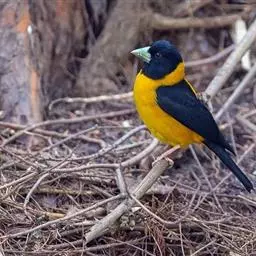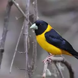 黄颈拟蜡嘴雀:小型鸟类,体长20-22厘米。嘴粗大,黑色。雄鸟整个头、颈、颏、喉和上胸辉黑色,…