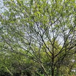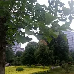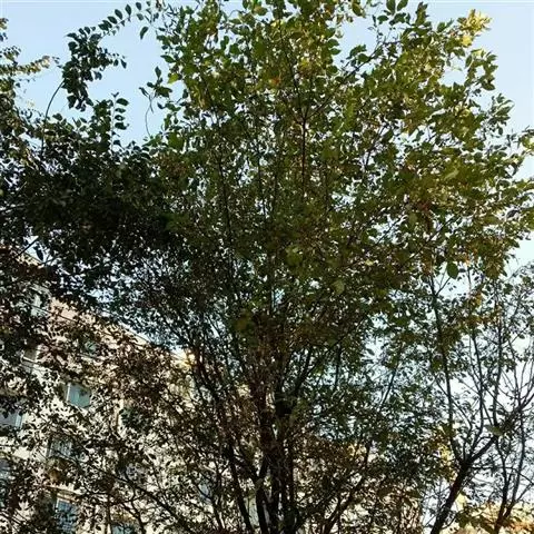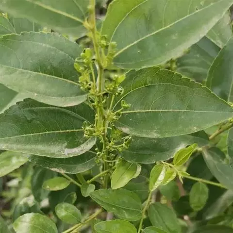 落叶大乔木,落叶前变为黄棕色,高达25米。树皮灰色,块状脱落,光滑,具有板状根。单叶,近对生,叶片矩状椭圆形,长5-14厘米,宽2-45厘米,薄革质,无毛,基部不对称,叶缘具钝锯齿,顶端钝形或钝尖,基部圆形或心形;叶柄长0.5-1.2厘米,常具2腺点。