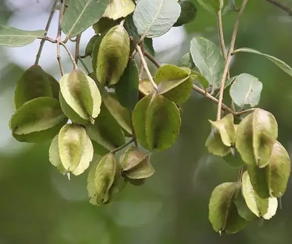 花两性,总状花序,呈黄白色,花萼钟状,5裂,无花瓣;雄蕊10枚,2轮排列;子房下位,1室,常有胚珠3颗。闭合果,果长2.3-3.5厘米,果皮纤维状木质,有5硬翅,有许多弯曲脉状条状。花期3-6月,果期9-11月。