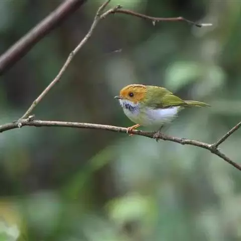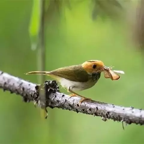 棕脸鹟莺:体长10厘米,是一种色彩亮丽而有特色的莺鸟。头栗色,具黑色侧冠纹。上体绿,腰黄色。下体白,…