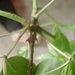 春秋两季均可进行,但以春插效果更佳。可于每年3-4月,剪取1-2年生的枝条进行扦插,插穗长10厘米左右,去掉大部分叶片,只保留端部的2-3片叶,减少水分蒸发,下切口在节下0.2厘米处,并用质量浓度为0.5‰的吲哚丁酸或1号ABT生根药液浸泡10秒,再将其插入沙床或蛭石中。少量扦插时用广口花盆盛装蛭石即可做插床,浇透水后蒙罩塑料薄膜保湿,维持25-30℃的生根适温,遮光40-50%,20-30天即可生根。插穗萌发新芽后再移栽上盆。在20-25℃的条件下,保持较高的空气湿度,4-6周可生根。