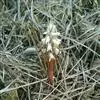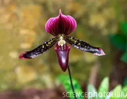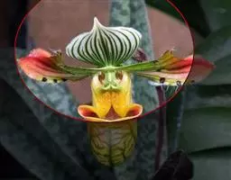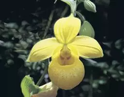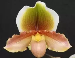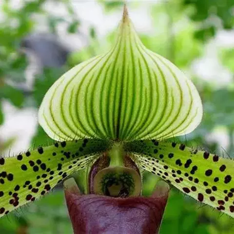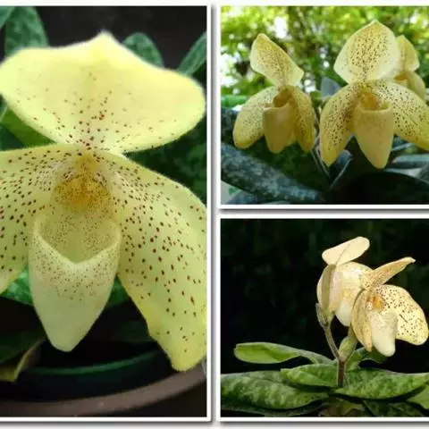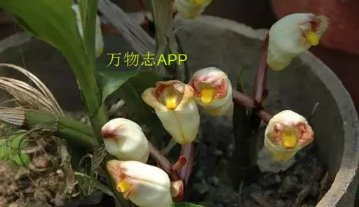 花葶肉质而肥厚,长15-20厘米,基部具数枚宽卵状披针形的鳞片状鞘;总状花序具3-4朵花;花苞片深茄紫色,凹陷,卵形或长圆形,长2-2.5厘米,先端急尖;花梗和子房浅茄紫色,长3-4厘米;花白色或稻草黄色,内面在中部以上具紫褐色斑点;中萼片近椭圆形,长2-2.5厘米,宽1厘米,上部外折,先端钝,具7条脉,侧萼片斜三角形或镰刀状长圆形,比中萼片长,上部外折,先端钝,基部歪斜而贴生在蕊柱足上,具7条脉;萼囊短而宽钝。
