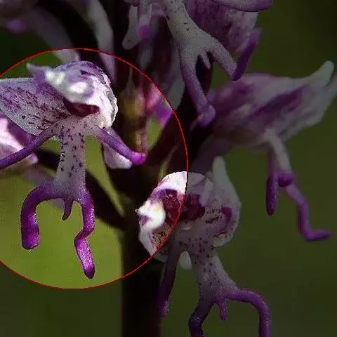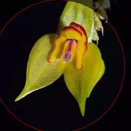 花瓣藏于萼筒内,近卵状椭圆形,长2-2.5厘米,宽1.1厘米,先端钝,基部收狭为爪,具7条脉;唇瓣3裂,以长约2厘米的爪贴生于蕊柱足的末端,爪黄色带黄褐色斑纹;侧裂片白色,近直立,镰刀状,围抱蕊柱;中裂片柠檬黄色,肉质,舌形,向外下弯,比侧裂片长,先端钝、全缘;唇盘白色带紫褐色斑点,具3-4条上缘带齿的褶片状脊;蕊柱白色,长约1.5厘米;蕊柱足白色带紫晕,长约2厘米,与蕊柱成直角弯曲。花期4-7月。