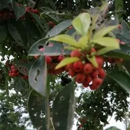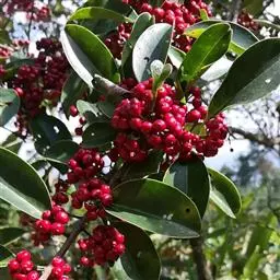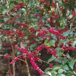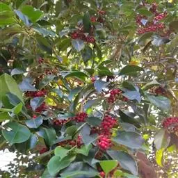 铁冬青 铁冬青为常绿灌木或乔木,枝繁叶茂,四季常青,果熟时红若丹珠,赏心悦目。铁冬青树叶厚而密,湖边或开阔地种植此树,能形成阴蔽的环境,又能产生多层次丰富景色的效果,是理想的园林观赏树种。 有火烧叶子,不燃烧会形成黑色圆圈,故可做防火树种。