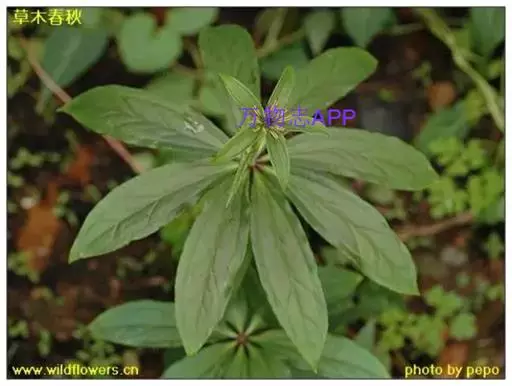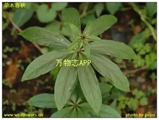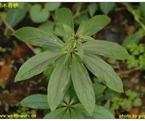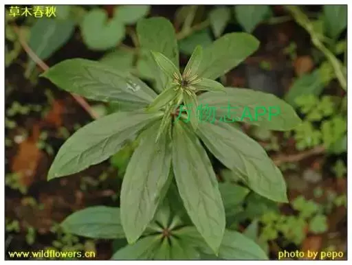 ① 七叶一枝花(《本草蒙筌》) 多年生直立草本,全体光滑无毛,高30~100厘米。根茎肥厚,黄褐色,结节明显,具鳞片状叶及众多须根。茎单一,青紫色或紫红色,直径约1厘米,基部有膜质叶鞘包茎。叶轮生茎顶,4~9片,通常为7片,长椭圆形或椭圆状披针形,长9~23厘米,宽2.5~7厘米,先端渐尖或短尖,全缘,基部楔形,膜质或薄纸质,绿色,有时下面带紫色;主脉3条基出。花单生顶端,花梗青紫色或紫红色;外列被片绿色,叶状,4~7片,长卵形至卵状披针形,长3~5厘米,宽1~1.5厘米,先端渐尖;内列被片与外列同数,黄色或黄绿色,线形,宽约1毫米,一般短于外列被片:雄蕊数与花被片同,花丝扁平,长3~5毫米,花药线形,金黄色,纵裂,长于花丝2~3倍,药隔在药上略延长、或无;子房上位,具4~6棱,花柱短,先端4~7裂,向外反卷;胚珠每室多数。蒴果球形,熟时黄褐色,3~6瓣裂,直径2~2.4厘米,内含多数鲜红色卵形种子。花期4~7月。果期8~11月。